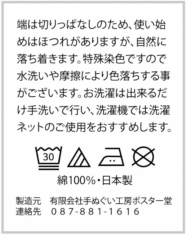 端は切りっぱなしのため、使い始めはほつれがありますが、自然に落ち着きます。特殊染色ですので、水洗いや摩擦により色落ちすることがございます。お洗濯は出来るだけ手洗いで行い、洗濯機では洗濯ネットのご使用をおすすめします。